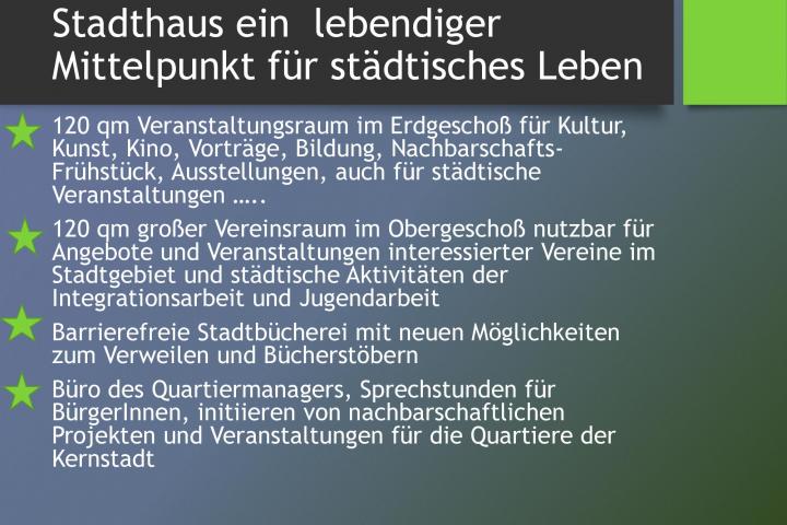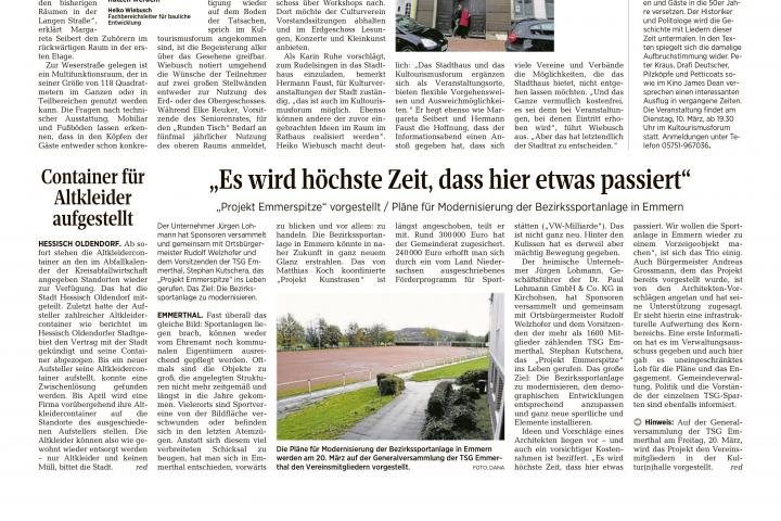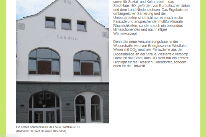 Die Stadt Hessisch Oldendorf, mit gut 18.000 Einwohnern gelegen im LK Hameln-Pyrmont sieht sich wie viele andere Orte ähnlicher Struktur, die nicht in unmittelbarer Nachbarschaft zu einem prosperierenden Oberzentrum liegen, mit verschiedenen Problemen der städtebaulichen Entwicklung konfrontiert. Insbesondere in ihrem grundzentralen Ort Hessisch Oldendorf werden diese manifest: Verlagerung von Handels- und Versorgungsfunktionen in Entwicklungsschwerpunkte außerhalb der Altstadt mit der Folge von Leerstand im ehemaligen zentralen Versorgungsbereich, Verfall historischer Bausubstanz, kein verfügbarer und den aktuellen Anforderungen entsprechender Bestand an Wohn- oder Gewerbeflächen, geringe Attraktivität wegen unzureichender kultureller oder sozialer Angebote, hohe Diversität in der Bevökerungsstruktur, viele Singlehaushalte, fehlende nachbarschaftliche Kontakte etc.In dem Bewusstsein, dass sich in den Zentren sozialer Zusammenhalt, ökologische Verträglichkeit, ökonomische Tragfähigkeit und kulturelle Innovation der Städte und Gemeinden entscheidet und die Zentren vielfältige Orte für Wirtschaft und Kultur, Orte zum Arbeiten und Wohnen, für Versorgung und Freizeit sind oder zumindest sein sollten, hat die Stadt Hessisch Oldendorf unter der Überschrift „Hessisch Oldendorf baut um“ eine städteplanerische Strategie zur Aufwertung der Innenstadt entwickelt und u.a. als Schlüsselimmobilie ein leerstehendes Lagerhaus revitalisiert, zum StadtHaus, als Begegnungsstätte für die Stadtgesellschaft und Standort für die Gemeinwesenarbeit umgebaut. Im Herz der Altsstadt, initiiert und koordiniert durch die GWA finden Vereine, Ehrenamt und Kultur einen neuen Ort des Zusammenhalts.