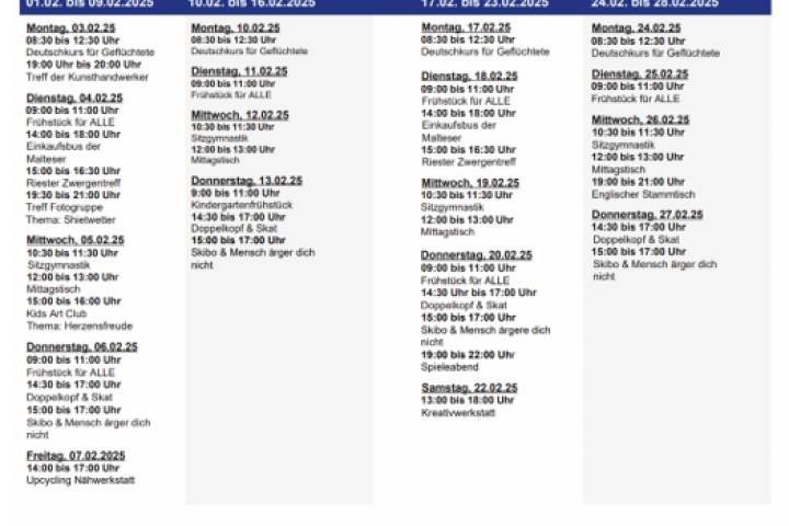 Unter der Koordination von zwei Teilzeitkräften bietet der Dorftreff ein vielseitiges Programm für alle Generationen. Auch wenn einsame SeniorInnen, Kinder und Familien Hauptzielgruppe sind, finden hier alle Riesterinnen und Riester Angebote nach ihren Bedürfnissen. Das gemeinsame Kochen ist ein tolles Format, das die Mitarbeiterinnen gern ausbauen möchten. Mit Vorträgen zur Vorsorge (Erste Hilfe, Letzte Hilfe, Patientenvollmacht...) und vielen weiteren sozialen Themen übernimmt der Dorftreff eine informative Aufgabe. Beim "Riester Abendbrot" stellen sich immer wieder Vereine vor, es gibt gut laufende Kooperationen mit Vereinen vor Ort.