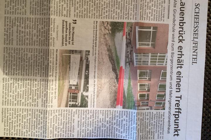 Aber der notwendige Bau einer neuen Grundschule 2023 ermöglichte es der Gemeinde, das alte Grundschulgebäude 2024 zurückzuerhalten und mit Fördermitteln des ZILE-Programms für eine Umnutzung als offenes Bürgerhaus vorzubereiten. 2018 hatte die Gemeinde bereits in der „AltenSparkasse“ einen Gemeinschaftsraum für Vereine und Gruppen eingerichtet, der stets ausgebucht ist. Dieser bietet nur isoliert voneinander Platz für jeweils ein Angebot und keinen Raum für Begegnung und ein übergreifendes Miteinander. Eine multifunktionale Nach- und Umnutzung des bisherigen Grundschulgebäudes an der Wümme kann eine Begegnungsstätte schaffen. Dieser generationenübergreifende Treffpunkt wird sicher die Integration besonders auch unserer Neubürgerinnen und -bürger aller Herkunft bewirken. Als Grundzentrum sollte Lauenbrück über eine solche identitäts- wie gemeinschaftsstiftende Einrichtung unbedingt verfügen und damit zugleich zur Versorgung mit soziokulturellen Angeboten und Dienstleistungen beitragen.