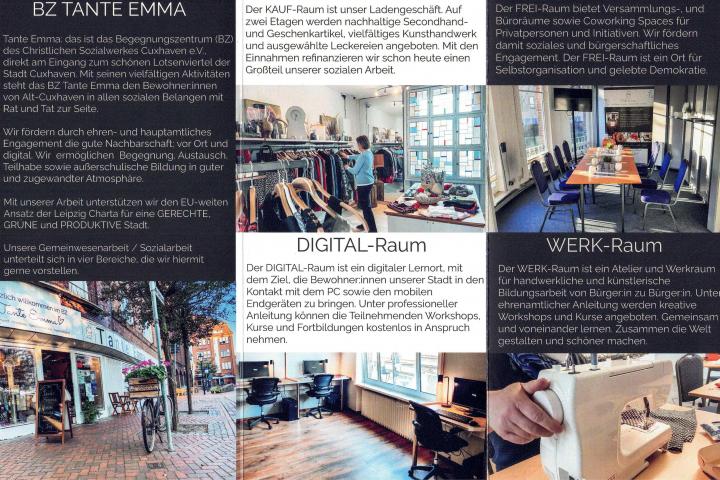 Nach dem Motto: „Nicht reden...machen!“ begann 2014 unsere Möbelhilfe für Geflüchtete, die Vereinsgründung erfolgte 2017. Die Zielgruppe wurde daraufhin auf alle Einwohner*innen (EW) erweitert. Durch die Verknüpfung von Ehren- und Hauptamt wurde zudem eine Basis für eine erste „zarte“ Gemeinwesenarbeit (GWA) im Innenstadtbereich gelegt. Durch die Kontakte in den Wohnungen der EW entstanden vertrauensvolle Beziehungen. Daraus ergaben sich Kenntnisse von weiteren Bedarfen u. Nöten auch anderer EW. Es wurden Angebote etabliert oder zu anderen Beratungsstellen weitervermittelt. Was neben der aufsuchenden Geh-Struktur aber fehlte, war ein Ort, wohin die EW dann auch kommen konnten. 2020 haben wir mit der Eröffnung des Begegnungszentrums (BZ) Tante Emma eine konkrete Anlaufstelle (Komm-Struktur) im Innenstadtbereich erschaffen. Dessen 5 Bereiche KAUF-, WERK-, FREI- und DIGITAL-Raum sowie unser Stadtteilbüro erfüllen jeweils eigene Funktionen, sind aber unmittelbar voneinander abhängig. (s.A.)