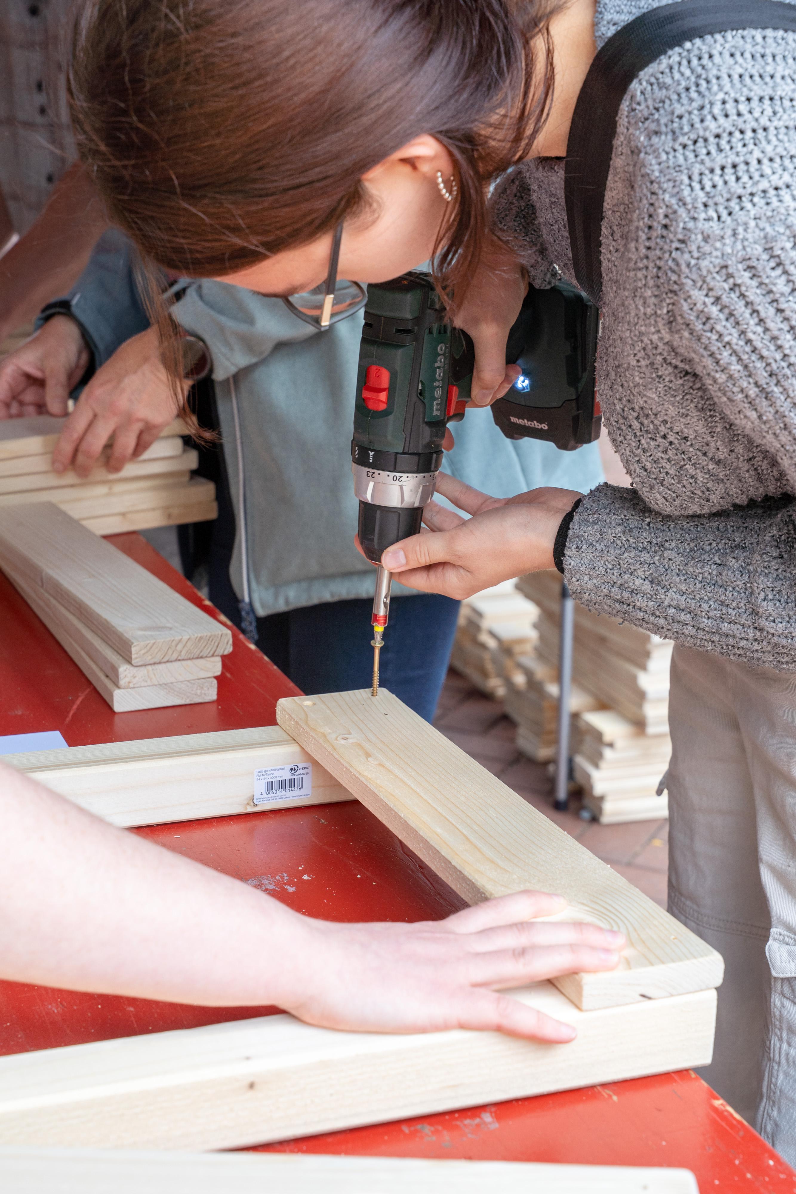 Mitmachbaustellen werden in mehreren Schritten vorbereitet und umgesetzt. Ziel ist es, gemeinsam mit den Bewohner*innen herauszufinden, welche Orte verbessert werden sollen und wo Handlungsbedarf besteht. In der Planungsphase werden Ideen gesammelt, Prioritäten gesetzt und gemeinsam Entwürfe entwickelt. Dabei steht von Anfang an fest: Später wird gemeinsam umgesetzt. Die Umsetzungsphase findet meist an Bautagen statt und bildet den Kern der Mitmachbaustellen. Bewohner*innen packen selbst mit an: Es wird gesägt, geschraubt, gestaltet uvm. Jede Person kann ihrer Fähigkeiten einbringen oder neue handwerkliche Erfahrungen sammeln. Gleichzeitig entstehen Begegnungen und Austausch im Quartier. Durch das gemeinsame Arbeiten entstehen sichtbare Ergebnisse wie Hochbeete oder mobile Stadtteilmöbel. Diese zeigen, was Engagement bewirken kann und stärken das Verantwortungsgefühl für den öffentl Raum