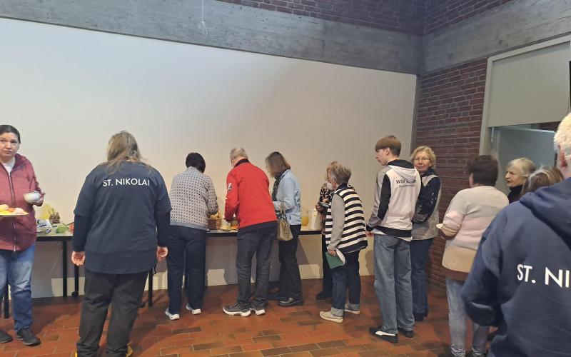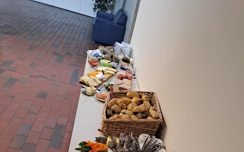 Ein Team aus Haupt- und Ehrenamtlichen bereitet gemeinsam ein Frühstücksbuffet vor. Es werden Gruppentische mit Platz für 8 Personen gestellt. Das Motto ist: Man kann alleine kommen, aber man muss nicht alleine essen. Die Ehrenamtlichen arbeiten in der Küche inzwischend weitgehend selbstständig, der Fokus des Hauptamts liegt auf der Anregung der Kommunikation zwischen den Nachbarn. Wir schaffen Gesprächsanlässe. Das Angebot läuft auf Spendenbasis, die Einnahmen fließen komplett in den nächsten Einkauf. Jede:r zahlt was er/sei kann und möchte.